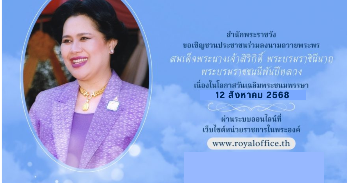 ขอเชิญชวนร่วมลงนามถวายพระพรทางออนไลน์ สมเด็จพระนางเจ้าสิริกิติ์ พระบรมราชินีนาถ พระบรมราชชนนีพันปีหลวง เนื่องในโอกาส วันเฉลิมพระชนมพรรษา วันที่ 12 ส.ค.68ผ่านเว็บไซต์หน่วยราชการในพระองค์ www.royaloffice.th
