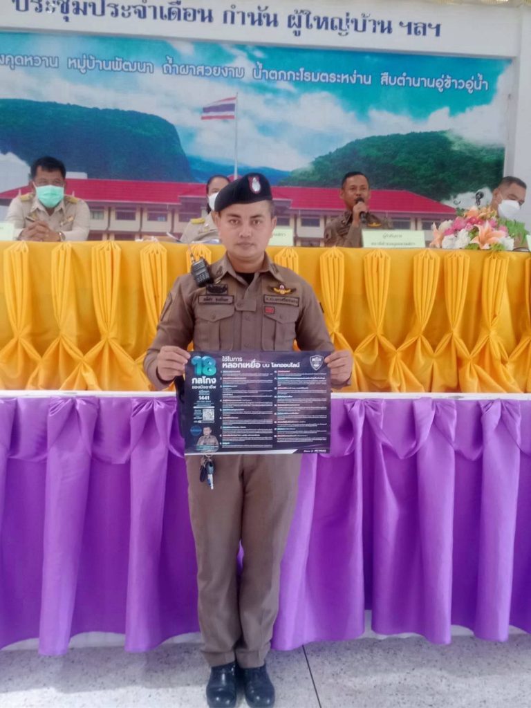 โดย : ผู้กำกับการสถานีตำรวจภูธรลานสกา เรื่อง เตือนภัยแก่ประชาชน 18 กลโกง ของมิจฉาชีพ ที่ใช้ในการหลอกเหยื่อบนโลกออนไลน์ เพื่อป้องกันมิให้หลงเชื่อ และเป็นข้อมูลแก่กำนัน ผู้ใหญ่บ้าน เพื่อเป็นกระบอกเสียงในการประชาสัมพันธ์ แก่ประชาชนในพื้นที่ต่อไป