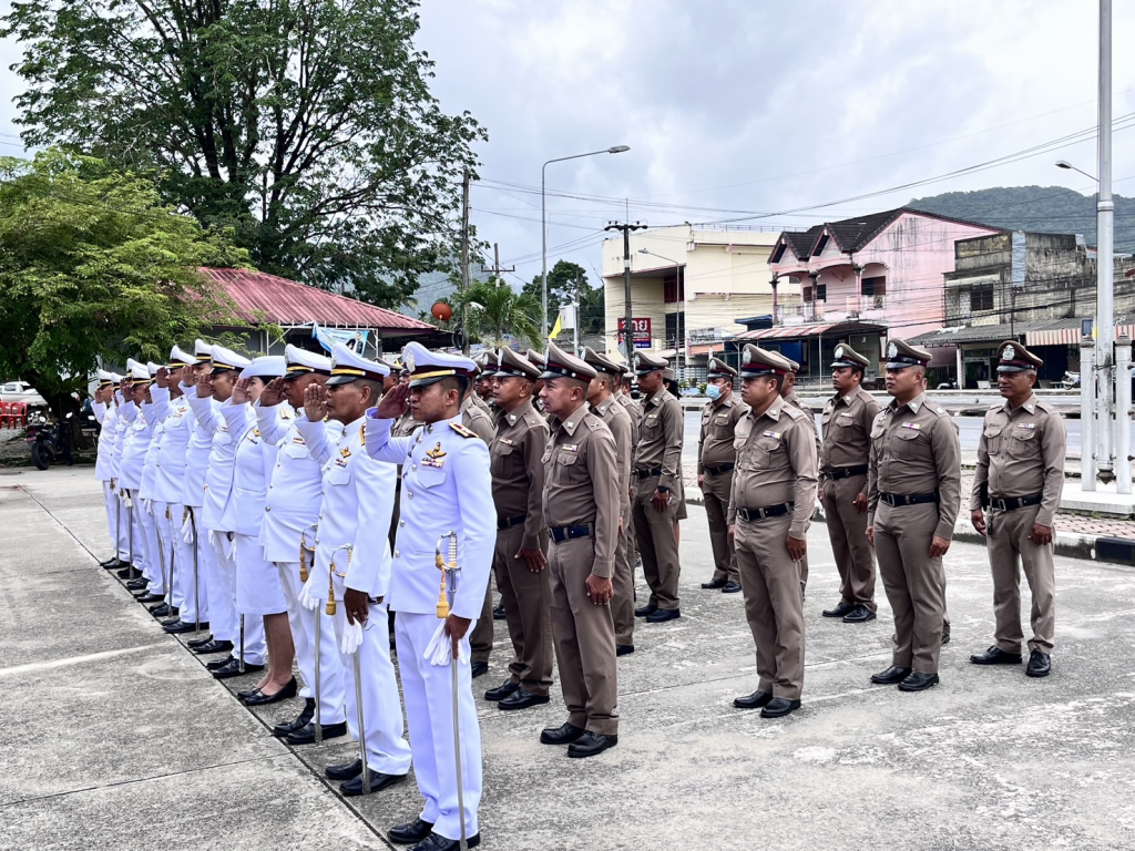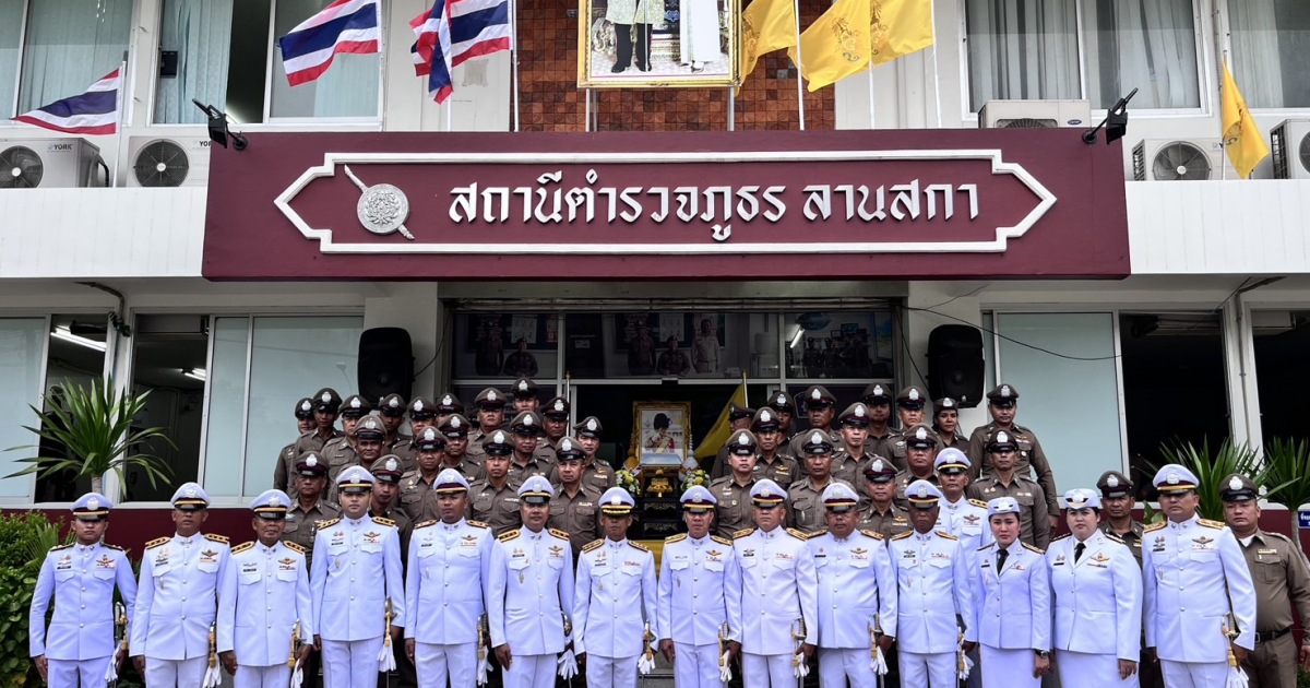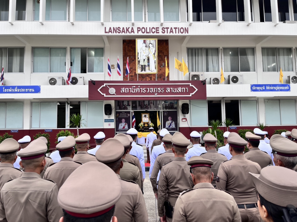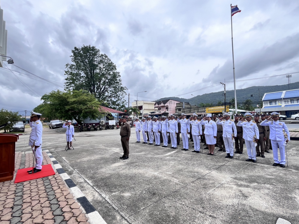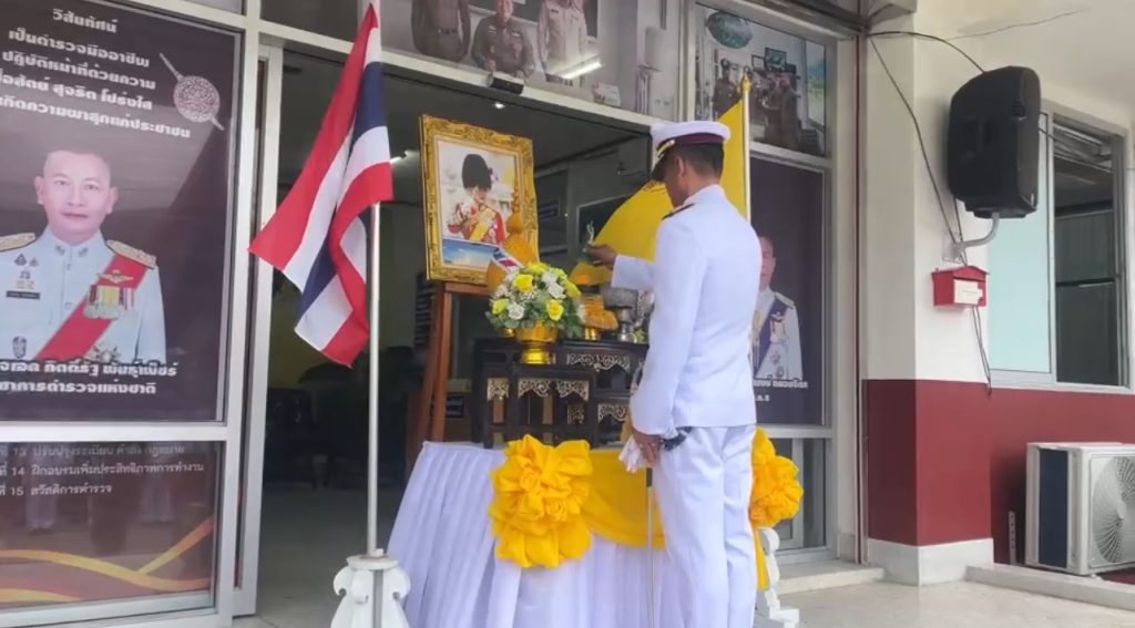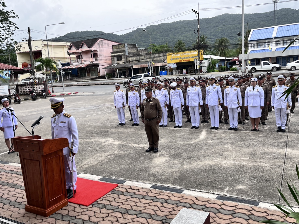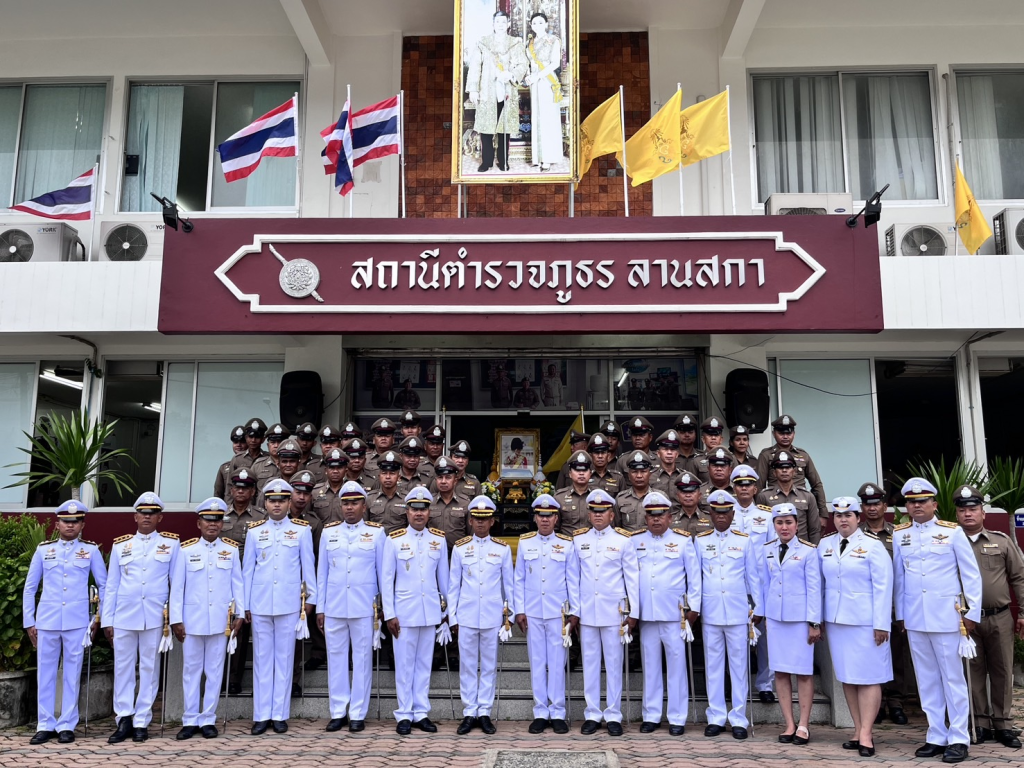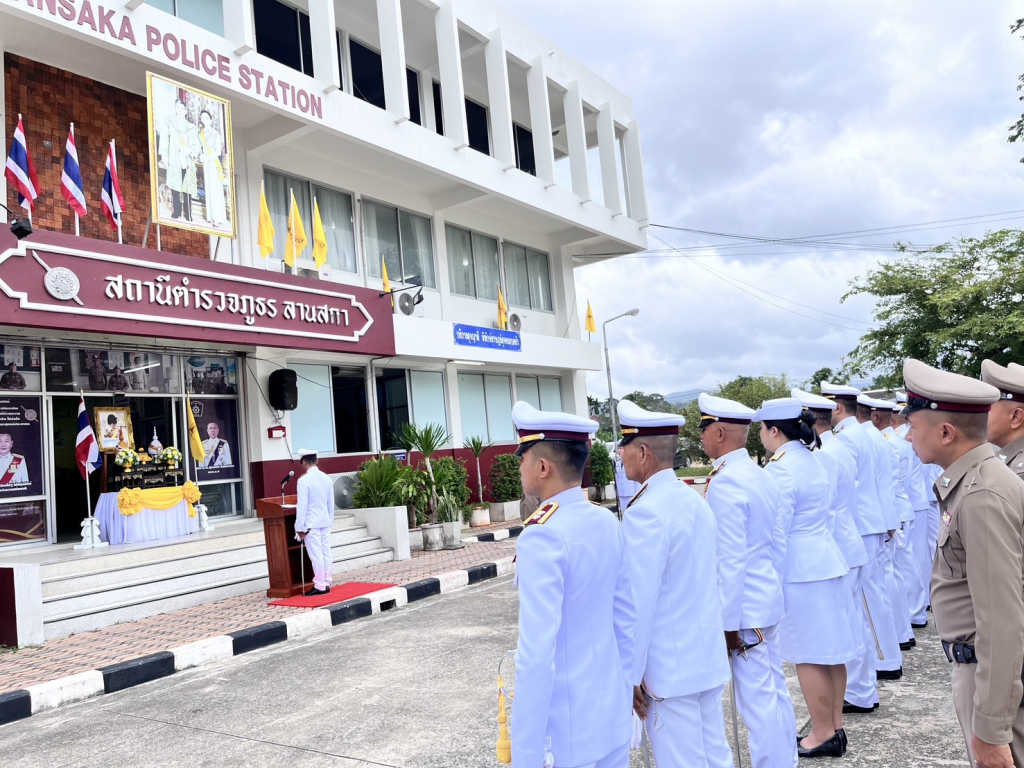 พ.ต.อ.ประภาส ศรีสังข์จร ผกก.สภ.ลานสกา ประธานในพิธีถวายสัตย์ปฏิญาณตนเป็นข้าราชการที่ดี และพลังของแผ่นดิน ถวายความเคารพพระบรมฉายาลักษณ์ พระบาทสมเด็จพระเจ้าอยู่หัว เปิดกรวยกระทงดอกไม้ ถวายราชสักการะฯ
