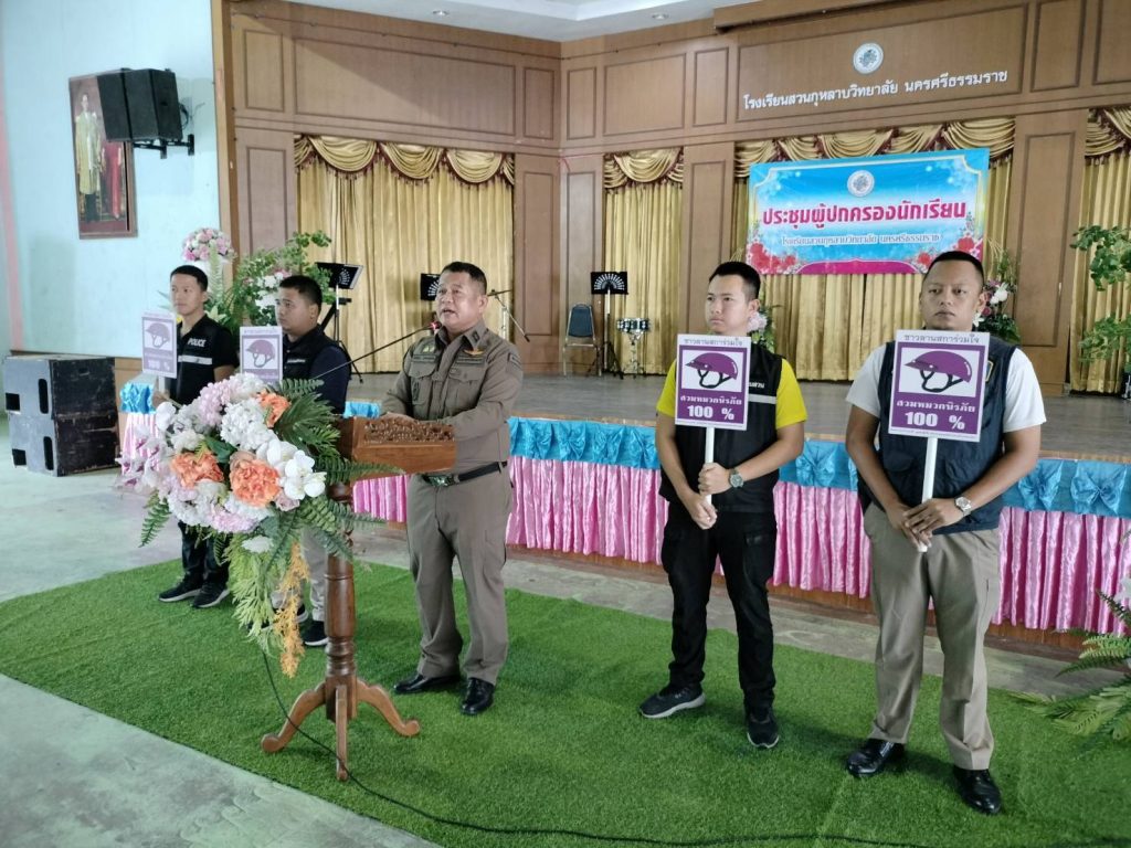 มอบหมายให้ พ.ต.ท.วรโชค วาจาสุจริต รอง ผกก.สส.สภ.ชะเมา รรท.รอง ผกก.ป.สภ.ลานสกา ,พ.ต.ต.สมปอง ศรีจันทร์ สว.สส.สภ.การะเกด ชรก.สวป.สภ.ลานสกา และเจ้าหน้าที่ตำรวจ สภ.ลานสกา ประชาสัมพันธ์จัดทำโครงการ “สวมหมวกนิรภัย ๑๐๐ เปอร์เซ็น” ณ อาคารเอนกประสงค์ โรงเรียนสวนกุหลาบวิทยาลัย นครศรีธรรมราช