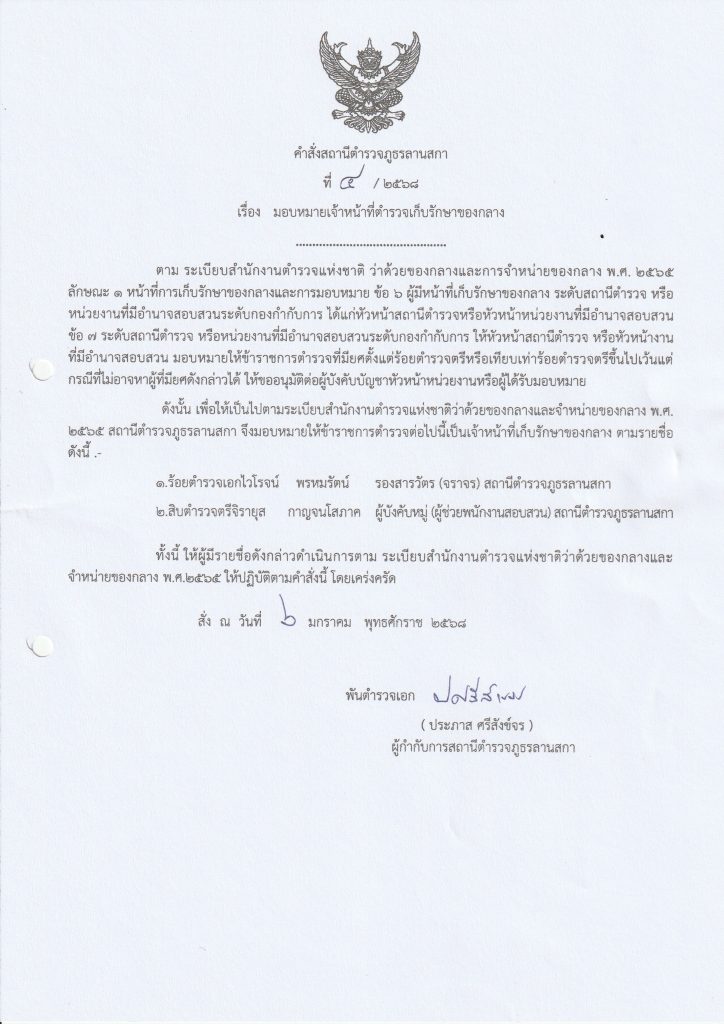 คำสั่งมอบหมายเจ้าหน้าที่ตำรวจเก็บรักษาของกลาง